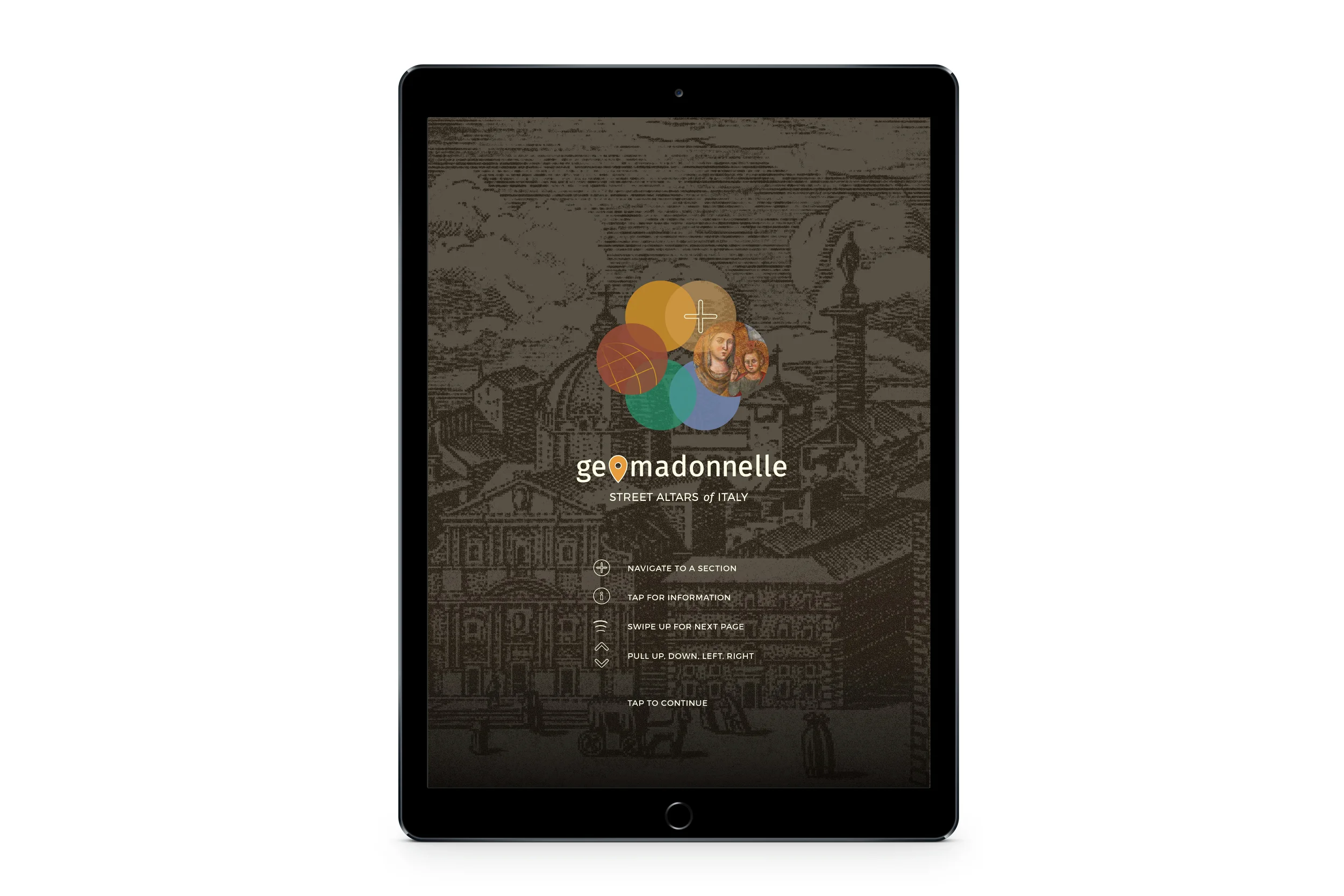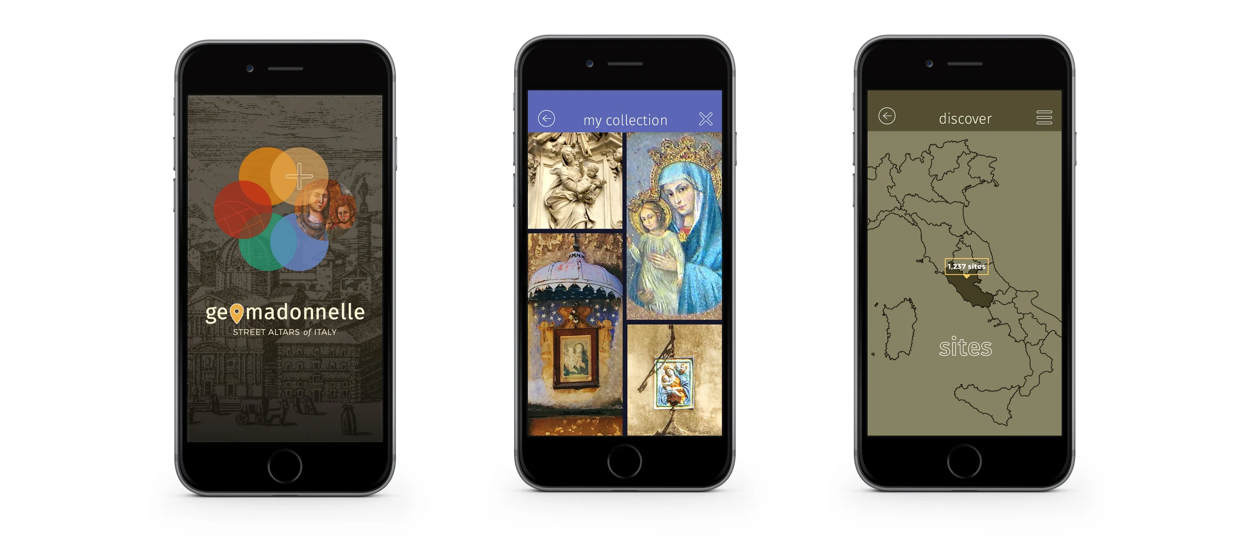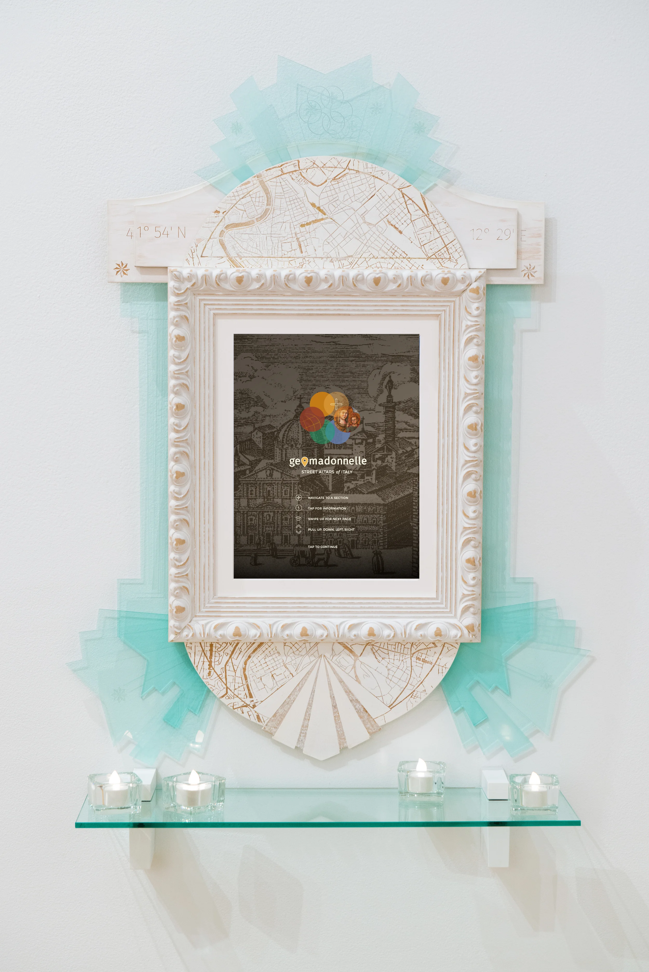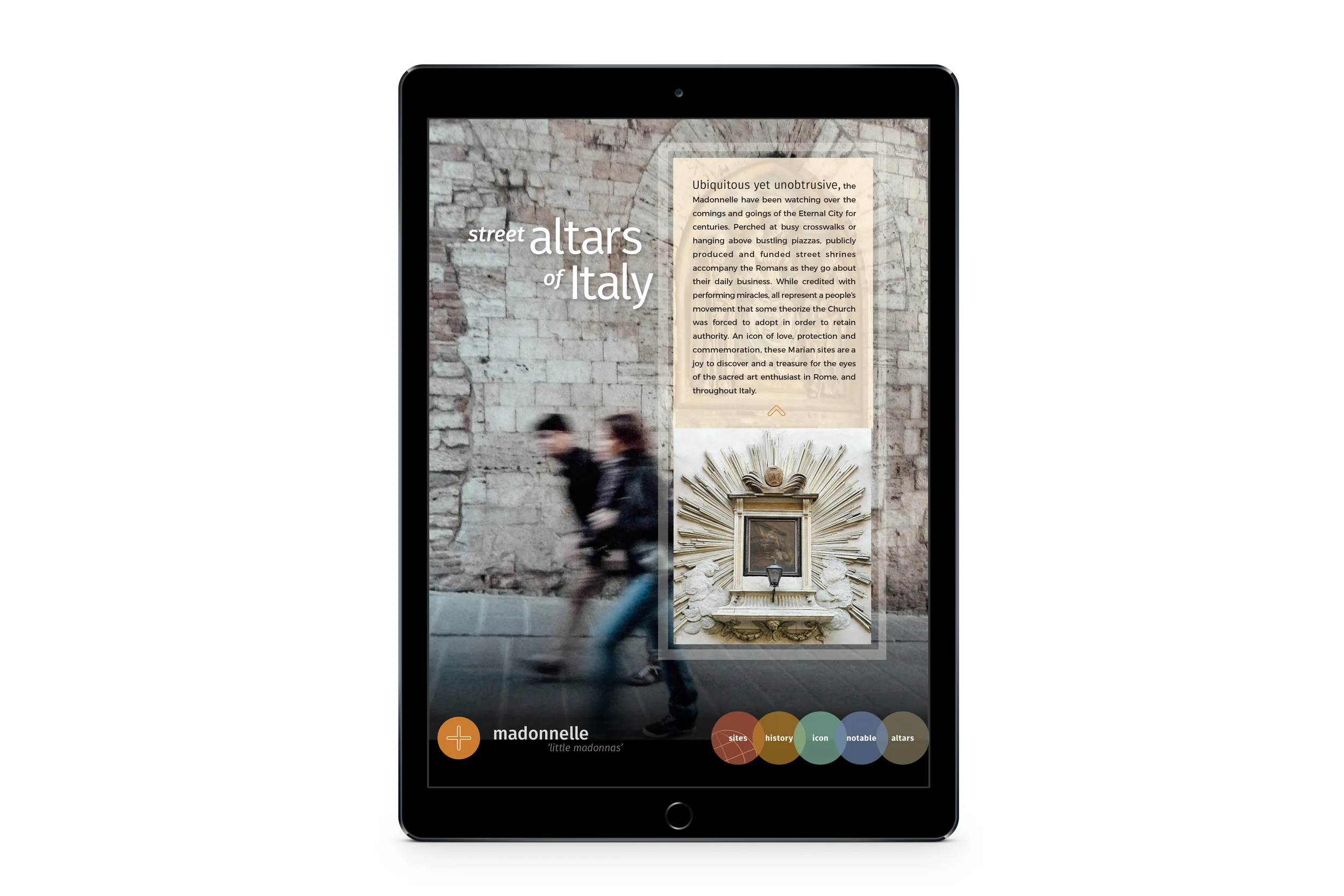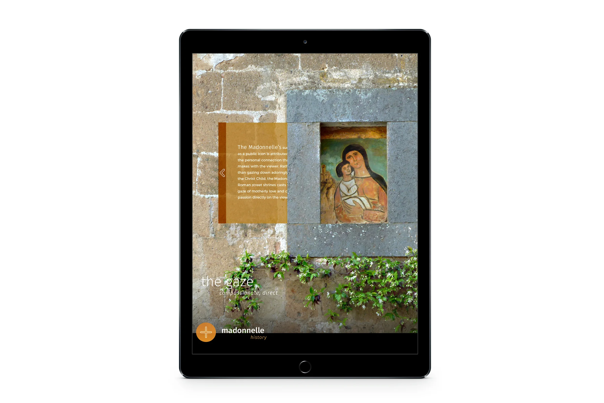 UBIQUITOUS AND SOMEWHAT FORGOTTEN, the 'madonnelle' or 'little madonnas' on the street corners of Italy forever remain symbols of love, protection and commemoration to the passers-by below. Once worshipped and venerated for their protective powers, their devotional lamps also served as a means of way finding throughout the city. Over 2,000 remain in Rome alone. Concepted for travelers and sacred art enthusiasts, the tablet app is a stand-alone or a wall-mounted interactive kiosk that explores the history of this global icon. The mobile app uses GPS geo spacial technology that tags each location for collecting and social sharing. Imaginably the collection grows virally within the participating community to include Marian sites globally in other countries such as France, Spain, and Latin America.