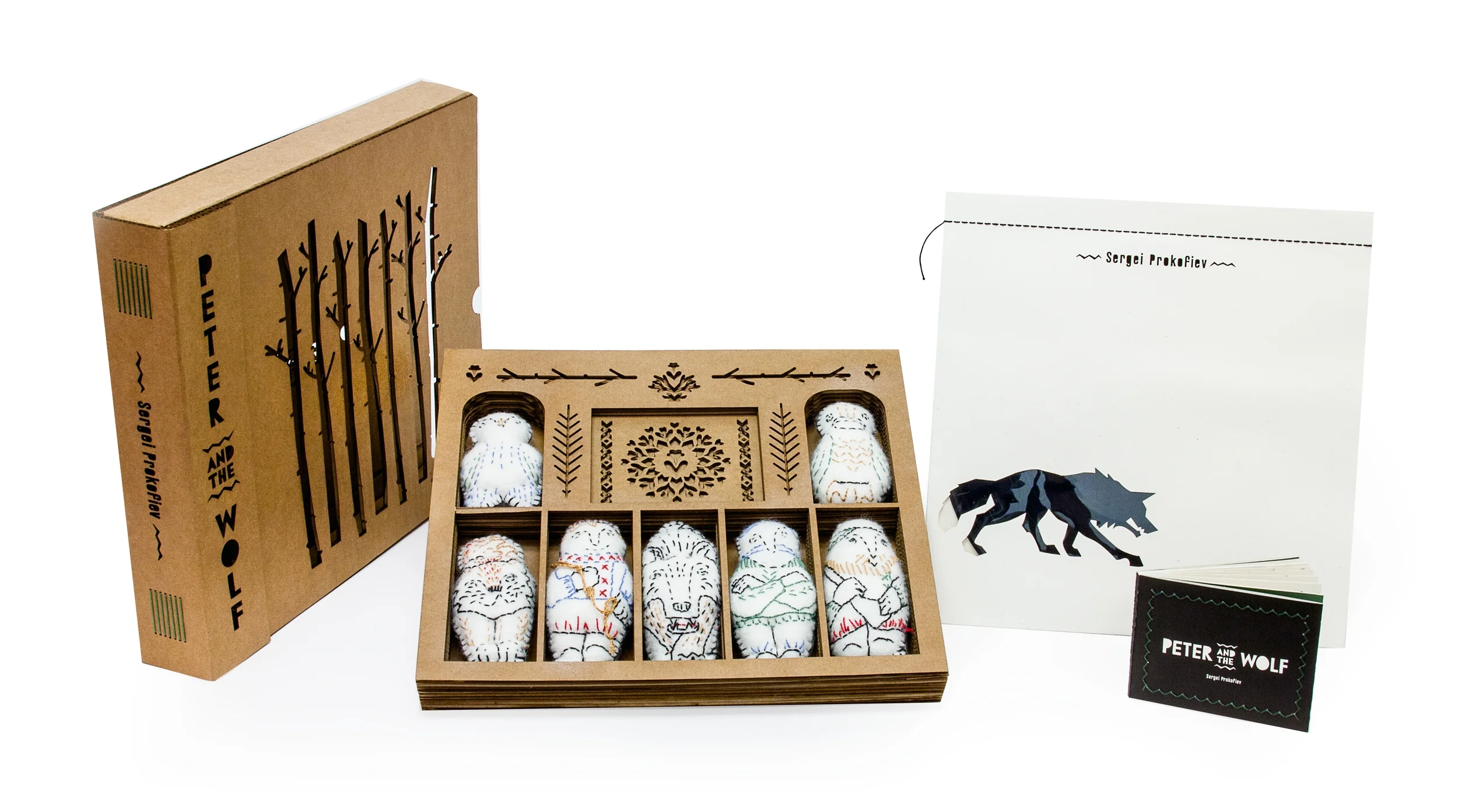 THE STORYTELLING POWER OF TOUCH enables children of a new generation to listen to and reenact the classical musical narrative of Sergei Prokofiev’s Peter and the Wolf. Keeping with the original intent of a child's introduction to the orchestra, each character in the story is represented by a particular instrument and a musical theme that is heard by the squeeze of a digital sound device hidden within each of the toys.